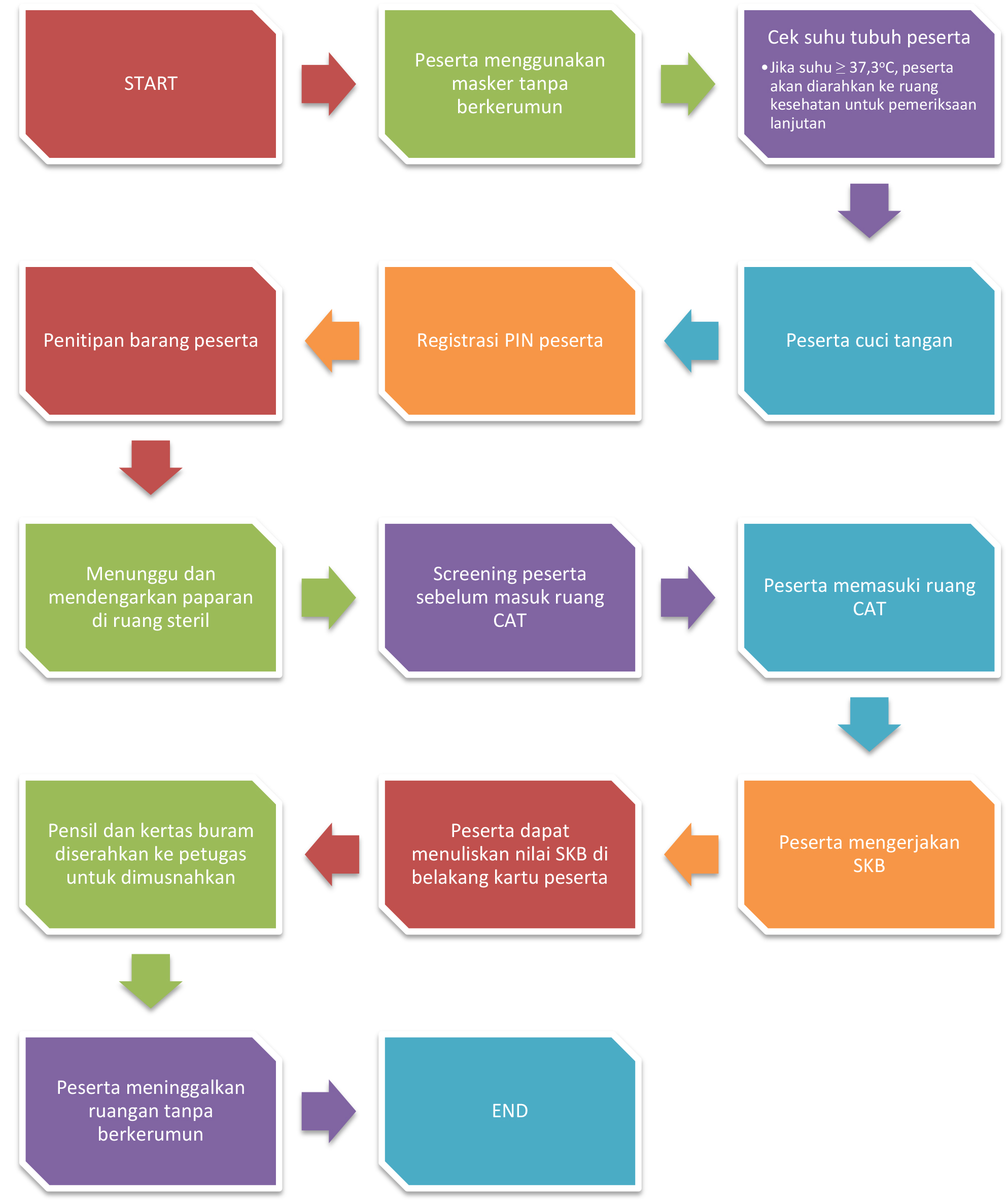 - Selama persiapan SKB kepada peserta diharapkan untuk menjaga kesehatan, menerapkan Perilaku Hidup Bersih dan Sehat (PHBS), mematuhi Protokol Kesehatan, memperhatikan dan mematuhi peraturan/pedoman terkait kriteria dan persyaratan perjalanan yang ditetapkan pemerintah.
